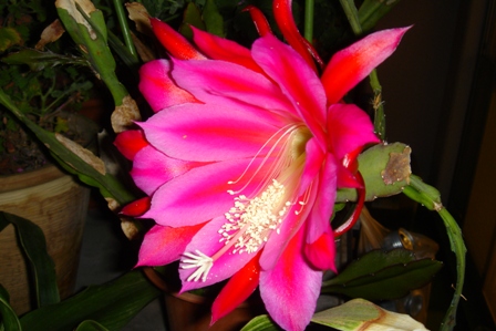 ゼラニウムに紛れて目立たなかったクジャクサボテンが咲くと、夏です。
