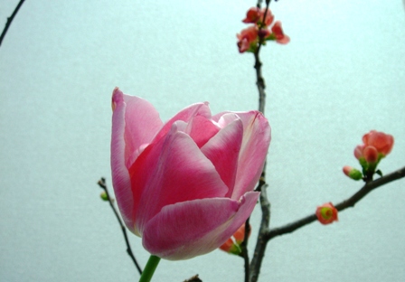 今日は「木瓜とチューリップ」、事務所内に活けてあります。