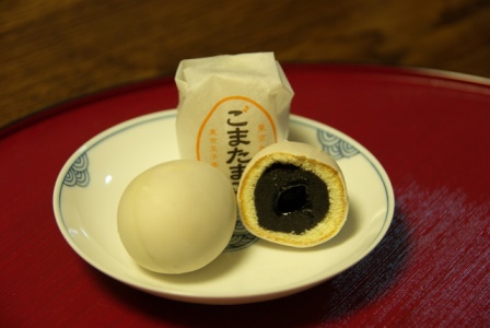 外側の白はホワイトチョコレート。 スポンジ生地の内側はあんこ、その中のとろりとした部分は胡麻ペースト。