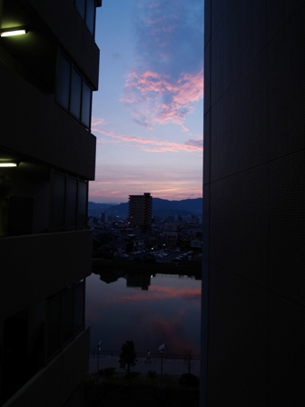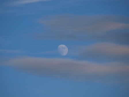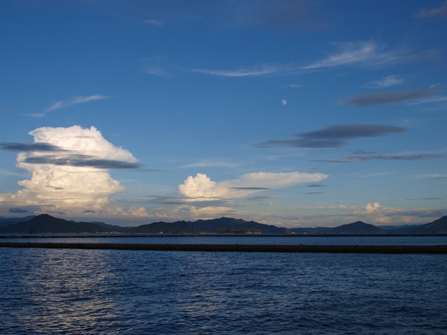 暮れようとする海辺に、月が上ってきます。 ここは広島市の西。 左にカルビー、右にモーツァルトの工場。 さて、次は月を望遠で撮ったもの。